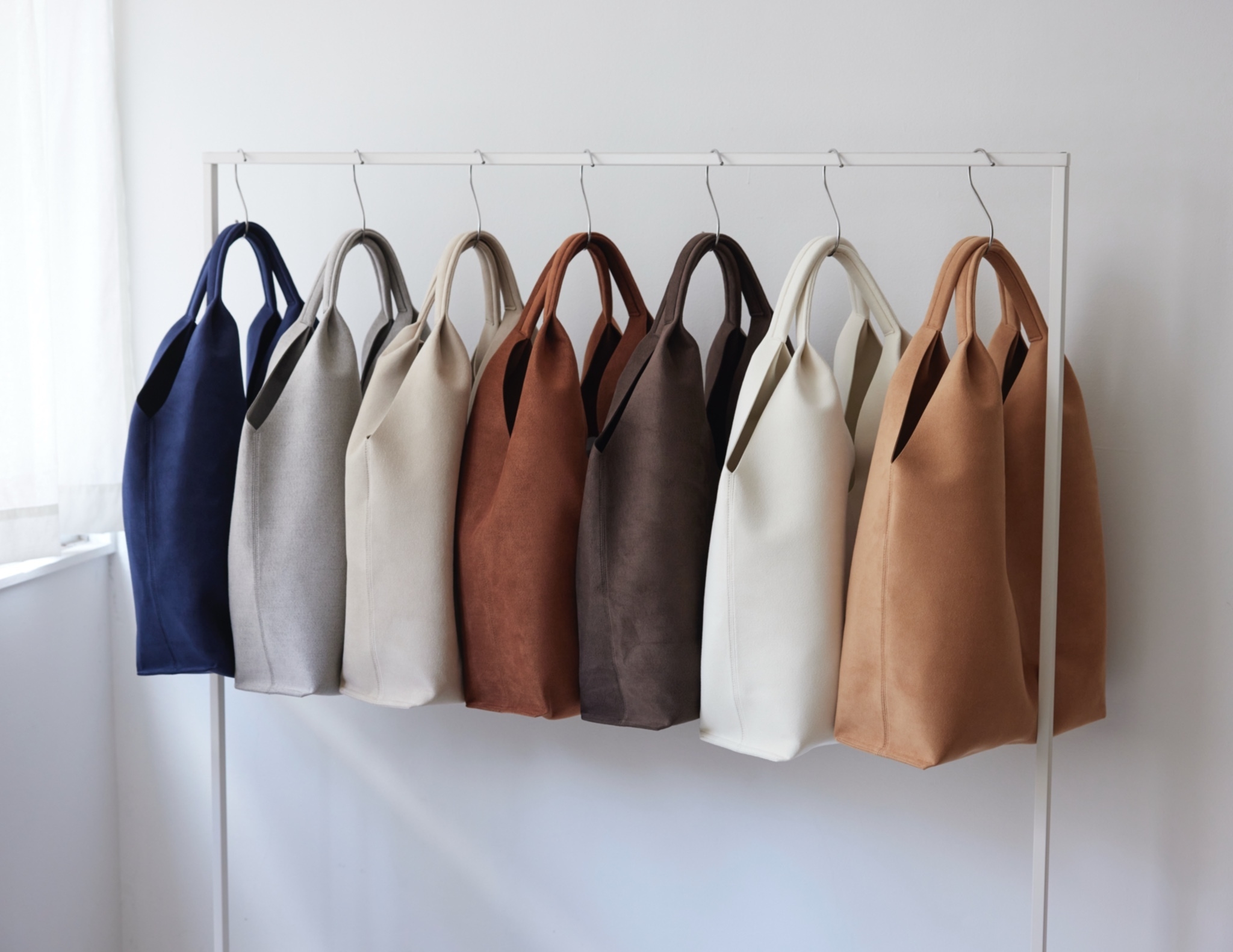 「ANORA」は、従来のバッグの常識を覆す革新的な設計が特徴のビッグショッパーバッグです。金具を使用しない独自の構造により、バッグ本体の洗濯機での丸洗いを実現。本体重量わずか350gという軽量性と、東レ社のプレミアム素材「Ultrasuede(R)」による上質な風合いを両立しています。
