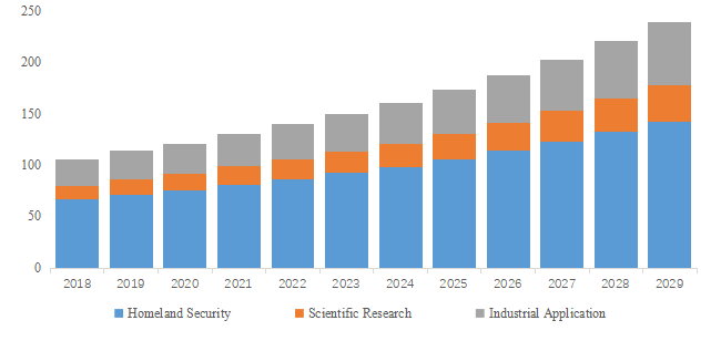 製品の用途別では、国土安全保障が最大の用途で、62%のシェアを占めている