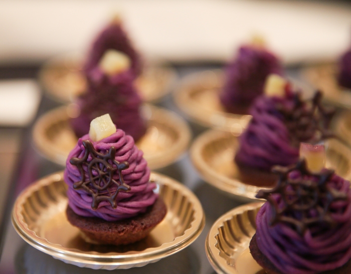 ・女王様のザクロ杏仁ジュレ・魅惑のライムジュレ・サバンナのダークフルーツケーキ・おばけかぼちゃプリン・シューキャラメルサレ・魔女のダークなチェリームース・魔法のブラックローズムース・海魔の宝石 カシスポワールムース・ボンボンショコラ(フォレノワール/トンカ)・マカロン(カシス/マロン)・真紅のいちじくタルト・悪名高き悪女の愛したモンブラン・アイシングクッキー