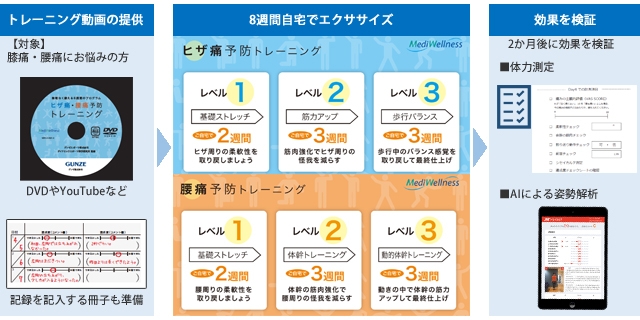 プログラムには、膝痛と腰痛それぞれ「レベル1(2週間)」「レベル2(3週間)」「レベル3(3週間)」の3段階があり、対象者(膝痛12名、腰痛14名)には20分間の運動プログラムをできるだけ毎日計8週間続けていただき、2か月後にグンゼスポーツ株式会社とダイナミックスポーツ医学研究所による体力測定および株式会社SapeetのAIによる姿勢解析を活用した効果検証を実施予定。参加者は、1~3の各レベルの運動内容について理学療法士とグンゼ スポーツから運動指導を受けられます。