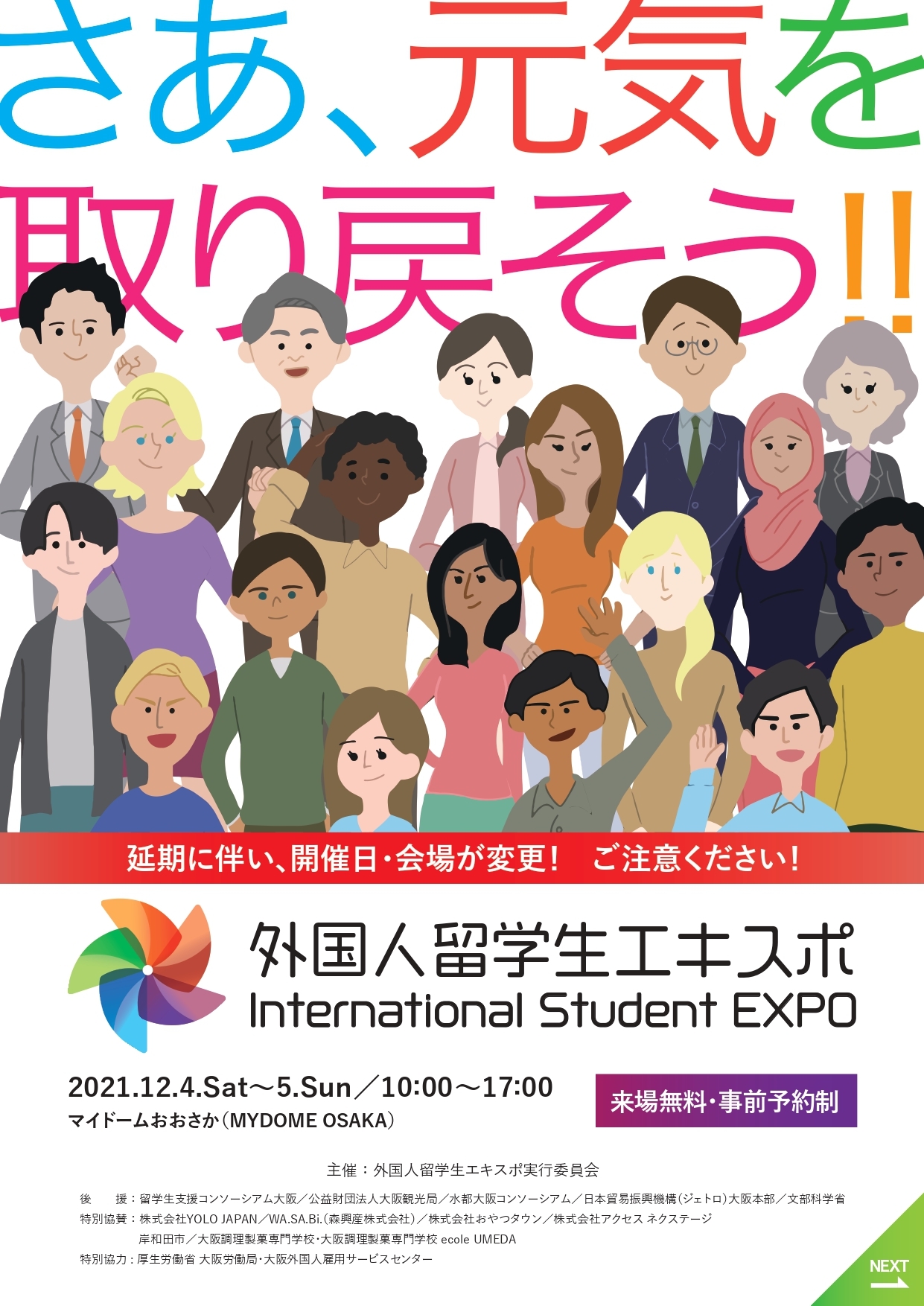 外国人留学生エキスポ実行委員会は公益財団法人大阪観光局の後援のもと、2021年12月4日(土)・5(日)の2日間「外国人留学生エキスポ~日本の留学生に元気を!日本に元気を!~International Student EXPO」を開催いたします。