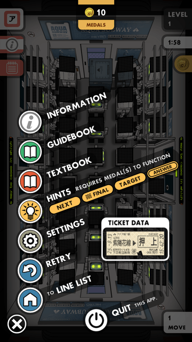 地下鉄車両が走行している間に乗客を動かして、頭に数字が表示してある乗客を、次の駅で数字順に降りられるような配置にできたら区間クリアです。各路線の終点を目指してください。