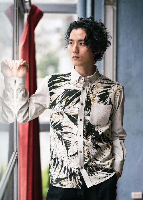 ダイナミックな総柄と無地との切り替えデザインがインパクト大なボタンダウン