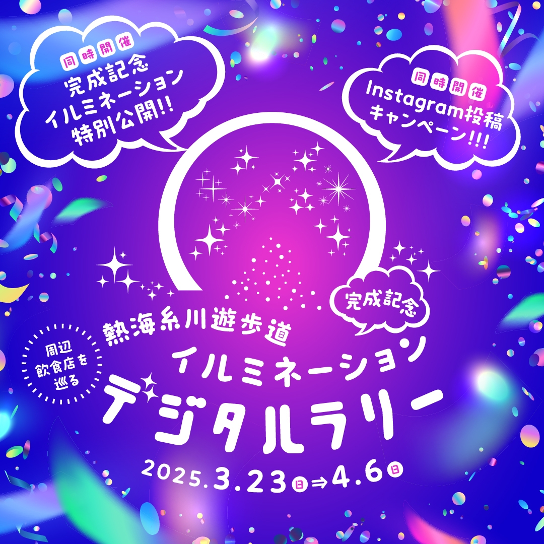 静岡県熱海市にある糸川遊歩道では2025年春、遊歩道周辺のナイトタイムを賑やかに演出するイルミネーションが完成いたしました。この完成を記念して2025年3月23日(日)より、周辺の飲食店を巡って熱海にまつわるアート作品がゲットできる周遊イベント「熱海糸川遊歩道イルミネーション完成記念 デジタルラリー」(主催:熱海市役所)を開催いたします。