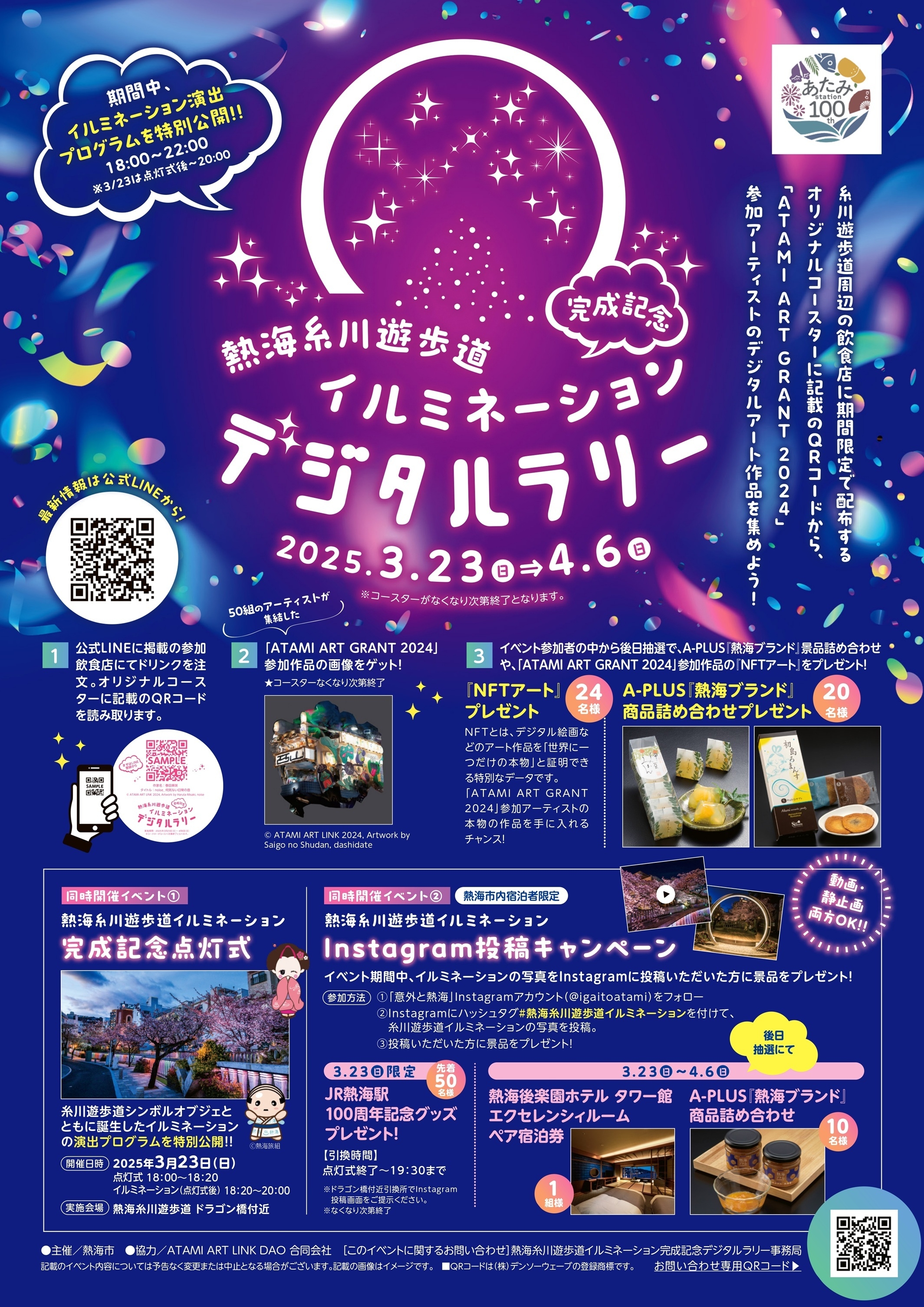 LINEのお友だち登録のみで気軽に参加できるイベントですので、期間中はぜひ熱海市で糸川遊歩道のイルミネーションと個性豊かな飲食店舗をお楽しみいただき、そして熱海のアート作品に触れてみてください。
