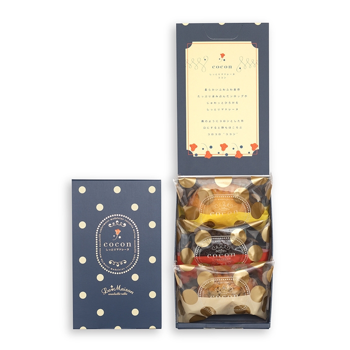 内容:しっとりマドレーヌココン(プレーン、ベルギーチョコレート、ロイヤルミルクティー)×各1個