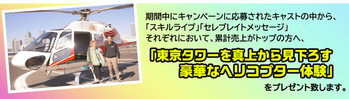 企画概要:期間中にキャンペーンに応募されたキャストの中から、「スキルライブ」「セレブレイトメッセージ」それぞれにおいて、累計売上がトップの方へ、「東京タワーを真上から見下ろす豪華なヘリコプター体験」をプレゼント致します。
