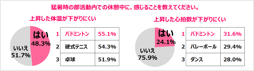 猛暑時の部活の休憩中「体温が下がりにくい」5割、「心拍数」2割 /「体温が下がりにくい」:1位「バドミントン」、2位「硬式テニス」