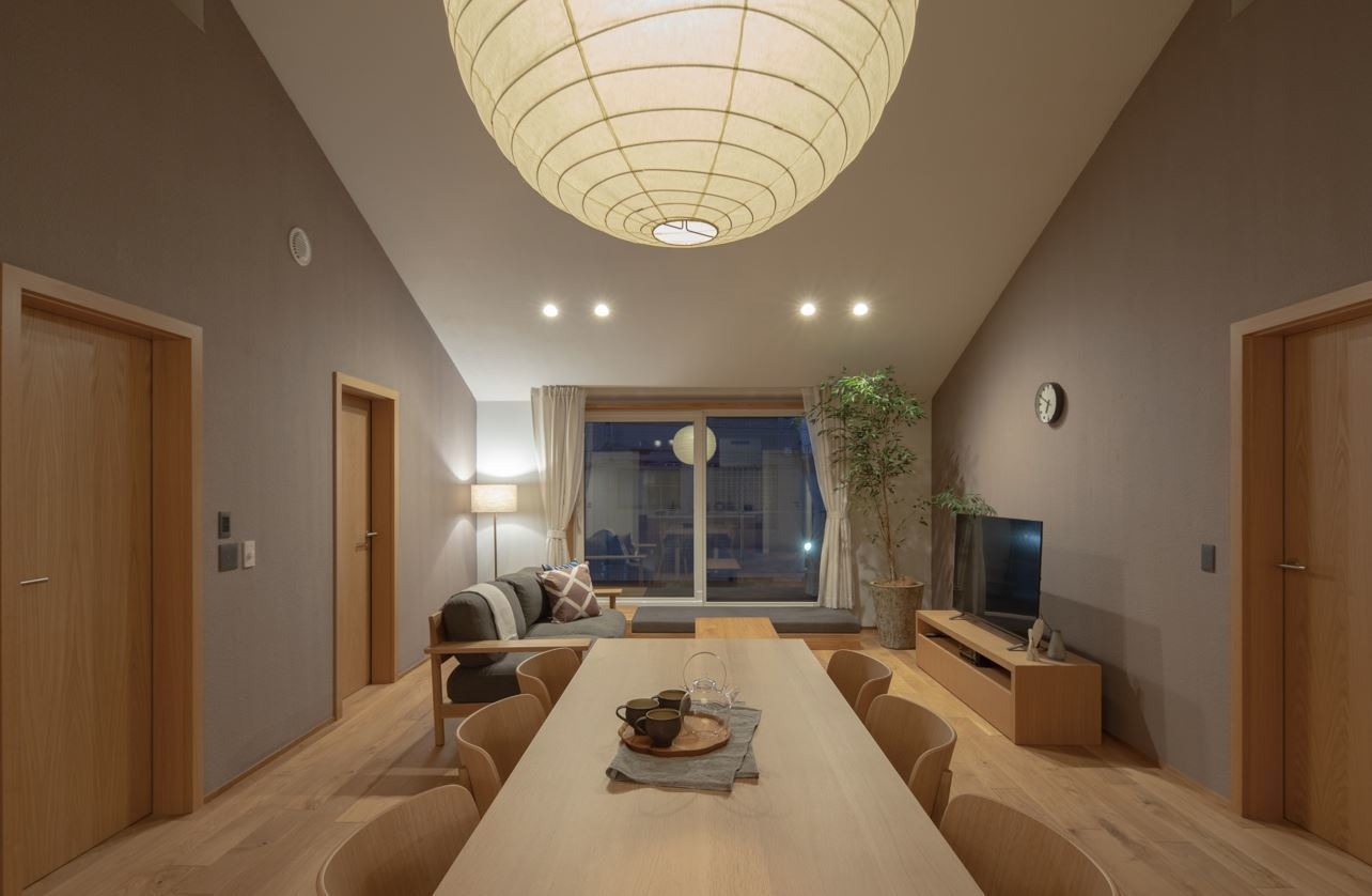 2022年8月にオープンした東京花小金井モデルハウスでは、2階建て2世帯併用(約80坪)の広さをたった1台の家庭用エアコンで1年中家の中どこでも快適な空間(温度25℃前後、湿度50%前後)をキープします。