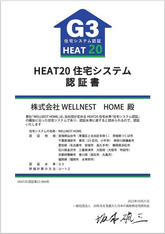 住宅会社の株式会社WELLNEST HOME(愛知県長久手市、代表取締役社長:芝山 さゆり)は、「一般社団法人 20年先を見据えた日本の高断熱住宅研究会」(以下 HEAT20)が提案する住宅システム認証で、最高水準にあたるグレード3(以下 G3)を全国複数の都府県でこの度同時取得したことをお知らせします。