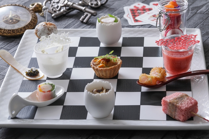 アフタヌーンティーは、不思議の国のアリスの物語から着想した金木犀と杏仁ライチの爽やかな帽子屋パフェや、チョコミント味のオペラ、ブラックラム酒を使用しオレンジの皮のアクセントが特徴の大人で上品な味の“オレンジマロンのうさぎさんムース”などのスイーツをご用意。ハイティーでは、チェス盤をイメージし、チェスの駒を基にした物語の登場人物をお料理で表現しました。