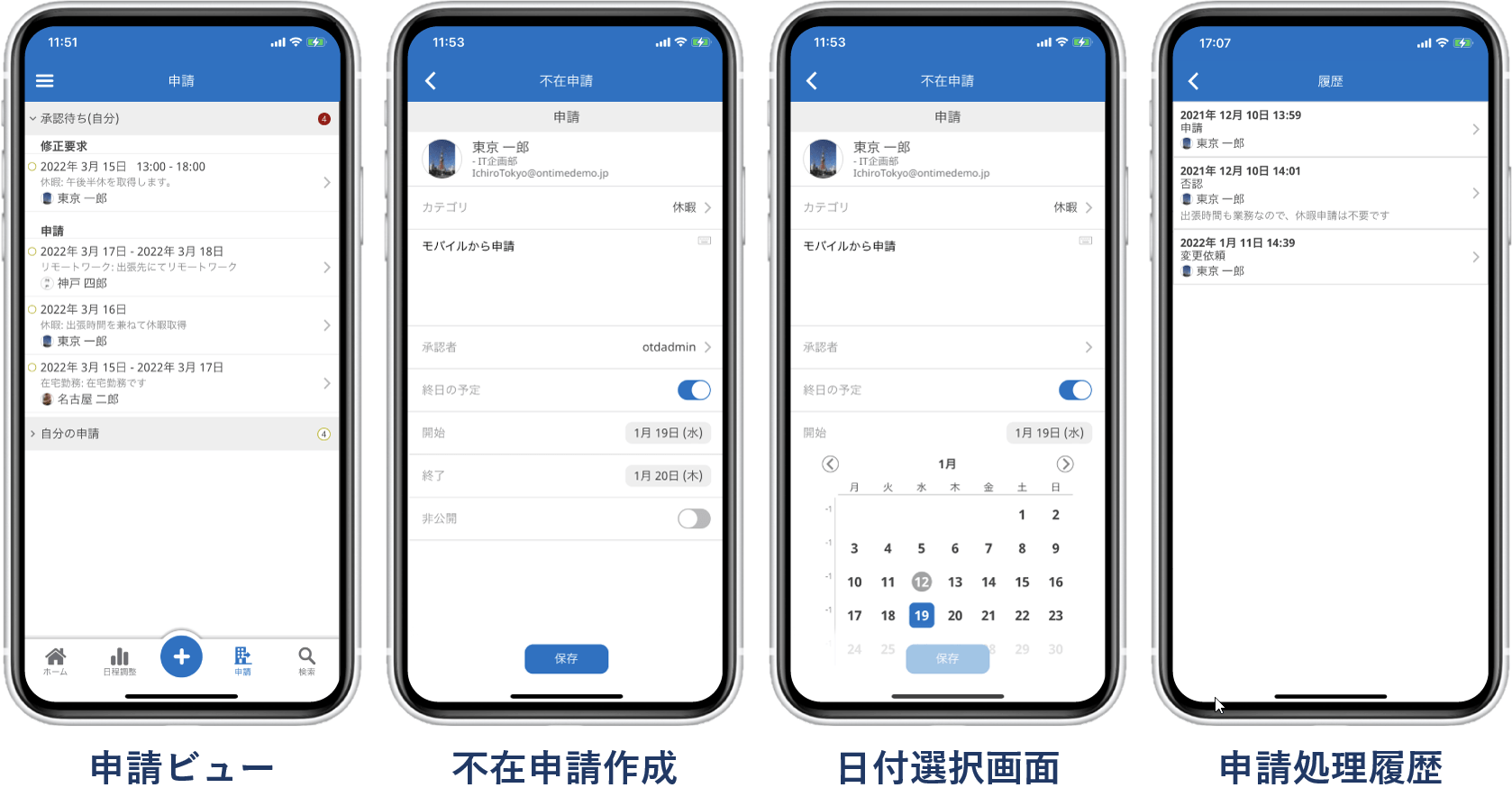 従来のメインビューを「ホーム」とし新たに「日程調整」「申請」「検索」ビューを準備し合計4つの画面を切り替えられるようにしました。いずれのビューにも左右どちらの親指からも操作しやすい配置にしました。