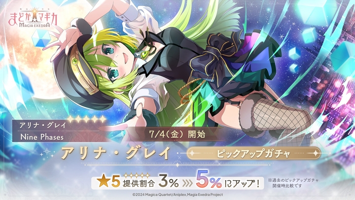 株式会社アニプレックス(本社:東京都千代田区 代表取締役 岩上敦宏 以下アニプレックス)は、アプリゲーム『魔法少女まどか☆マギカ Magia Exedra』(Magia Exedra:マギアエクセドラ)において、7月4日(金)12:00より、新たな★5キオク [Nine Phases] アリナ・グレイ(CV 竹達彩奈)を実装し、アリナ・グレイが登場するピックアップガチャを開始することをお知らせいたします。さらに、100日感謝祭第1弾としてアリナ・グレイが登場する10連ガチャを無料で1回引くことができます。
