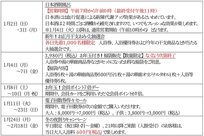 新年1月2日(日)、3日(月)は、営業時間を早め大好評の日本酒朝風呂を、また、各日先着1,000名様に入浴券などが当たる干支おみくじをご用意します。地元西宮郷の日本酒を使用した日本酒風呂は、贅沢な気分が味わえ、ハレの日にうってつけのおめでたい湯です。この機会に湯の華廊へお越しいただき、おくつろぎ下さい。