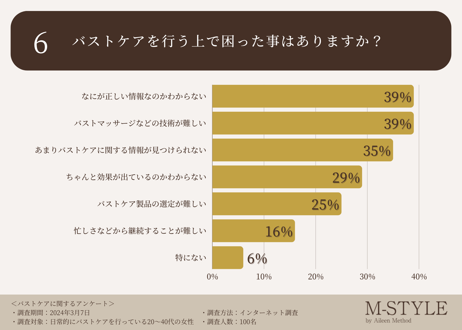 そこで、バストケアを行う上で困った事はあるか伺ったところ、「なにが正しい情報なのかわからない(39.0%)」「バストマッサージなどの技術が難しい(39.0%)」「あまりバストケアに関する情報が見つけられない(35.0%)」という回答が集まりました。