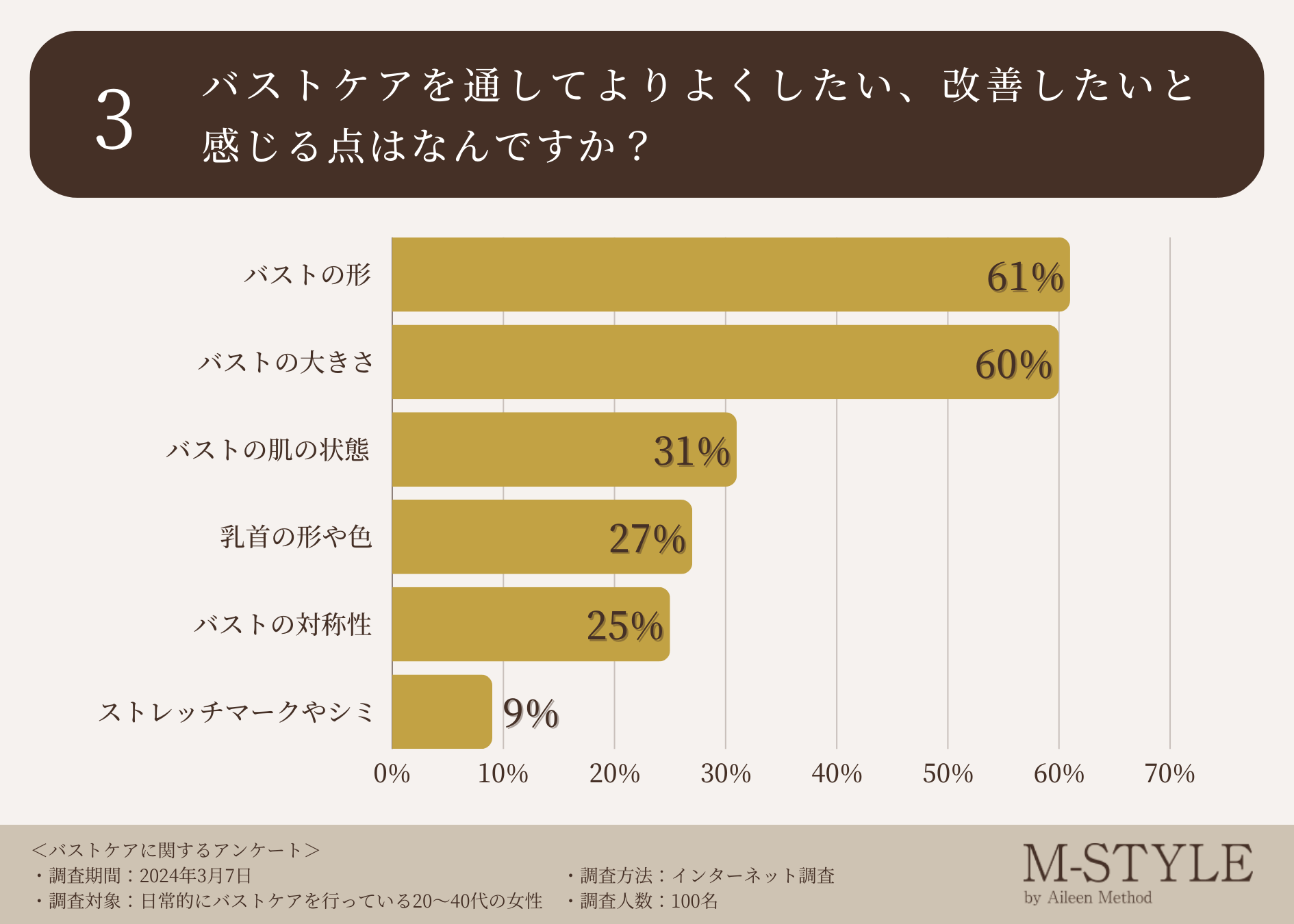 次に、バストケアを通してよりよくしたい、改善したいと感じる点について伺ったところ、「バストの形(61.0%)」「バストの大きさ(60.0%)」という回答が集まりました。