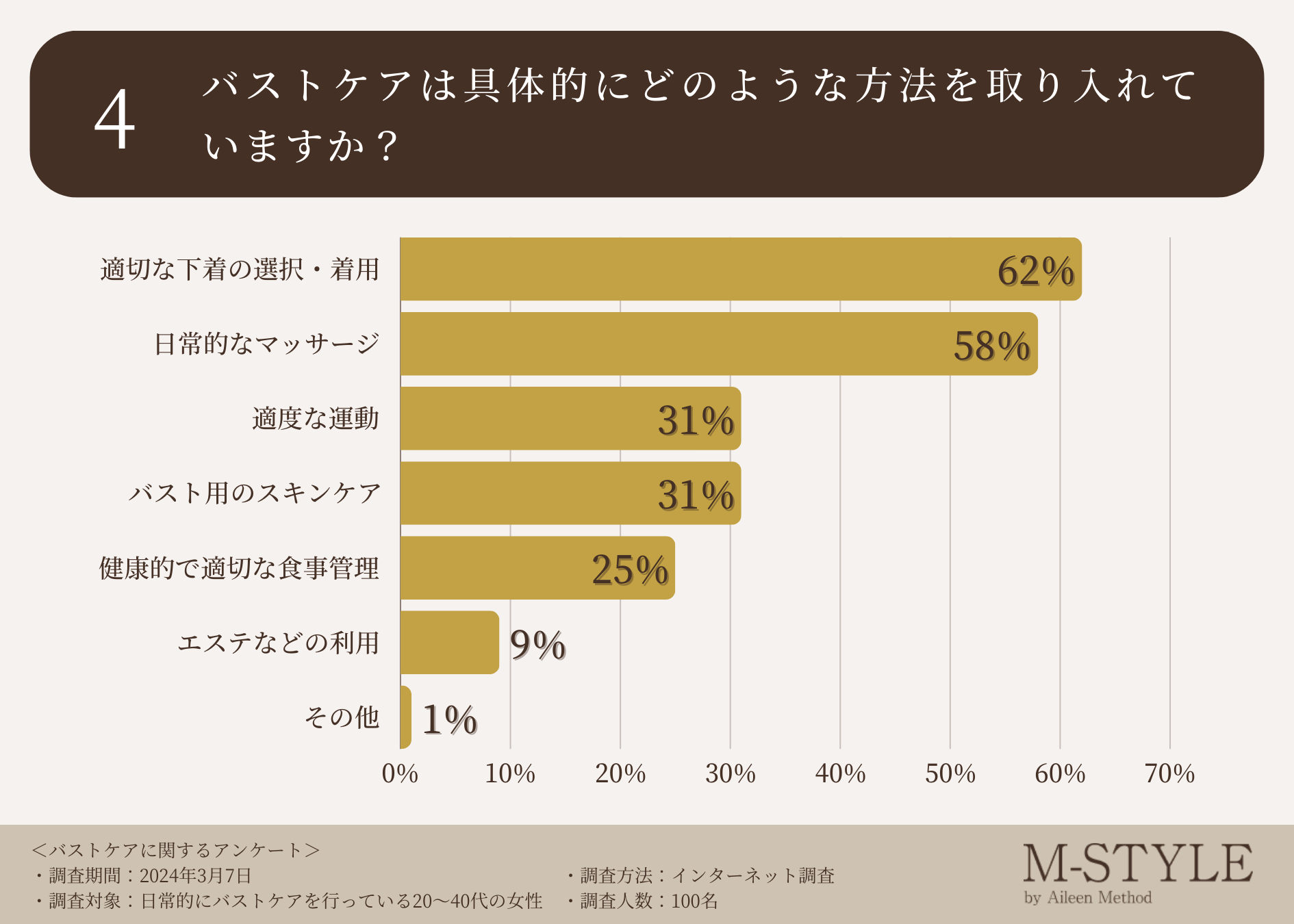 そこで、バストケアは具体的にどのような方法を取り入れているか伺ったところ、「適切な下着の選択・着用(62.0%)」「日常的なマッサージ(58.0%)」という回答が集まりました。