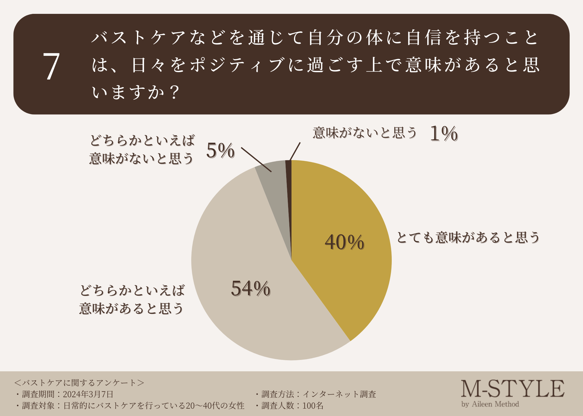 最後に、バストケアなどを通じて自分の身体に自信を持つことは、日々をポジティブに過ごす上で意味があると思うか伺ったところ、「とても意味があると思う(40.0%)」「どちらかといえば意味があると思う(54.0%)」という回答が集まりました。