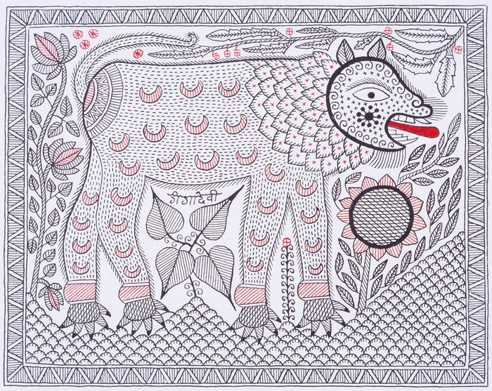 インドを代表するアーティストで、ミティラー画の第一人者として高く評価されるガンガー・デーヴィーの作品。完成を前に亡くなったため未完であるが、彼女の最高傑作といえる。