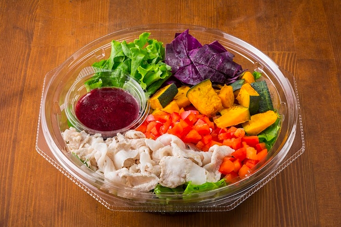 具材:グリーンリーフ・ベビーリーフ・豚肉・赤パプリカ・かぼちゃ・レッドキャベツ (ソース:ブルーベリー)
