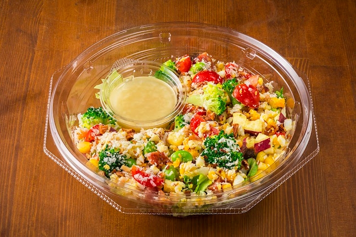 具材:グリーンリーフ・ベビーリーフ・レッドキャベツ・キャベツ・ブロッコリー・ミニトマト・枝豆・コーン・さつまいも・パプリカ・ベーコン・卵・アーモンド・ペコリーノロマーノチーズ(ソース:フレンチ)