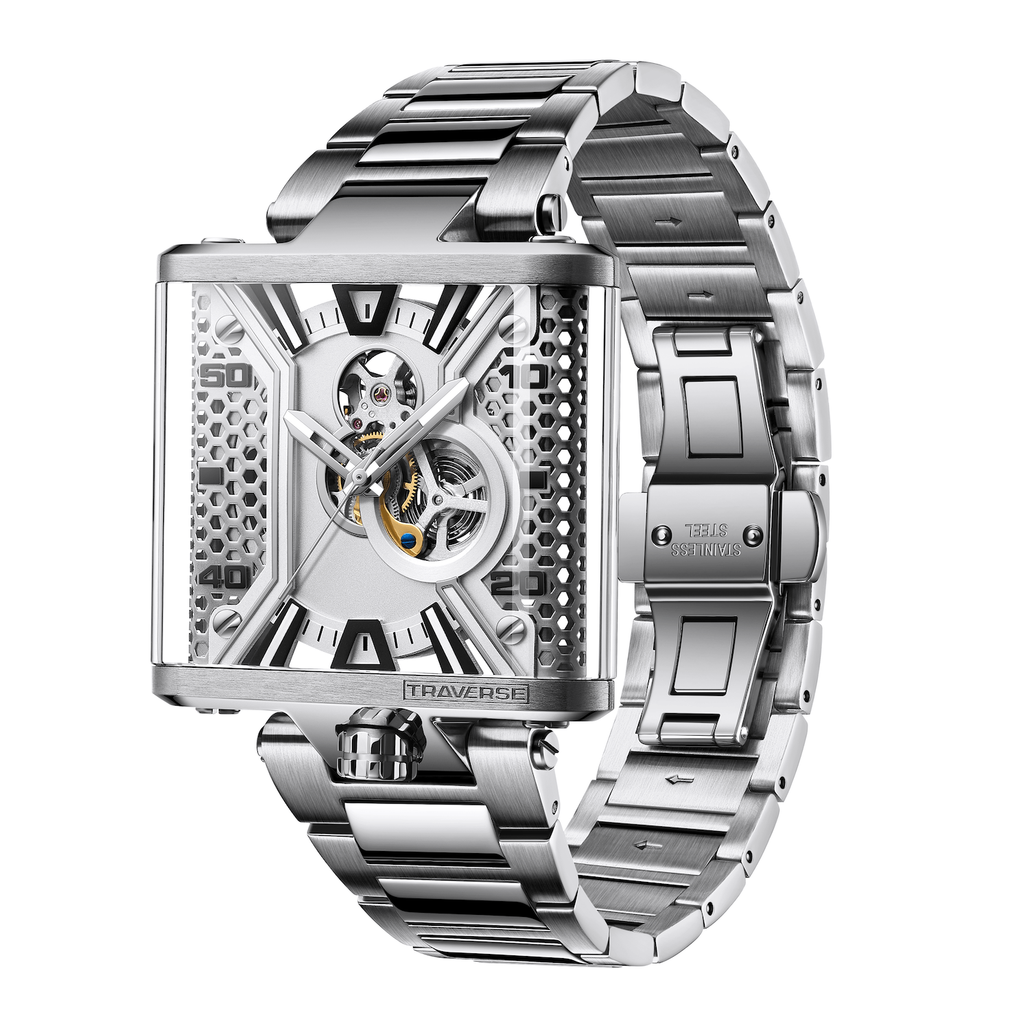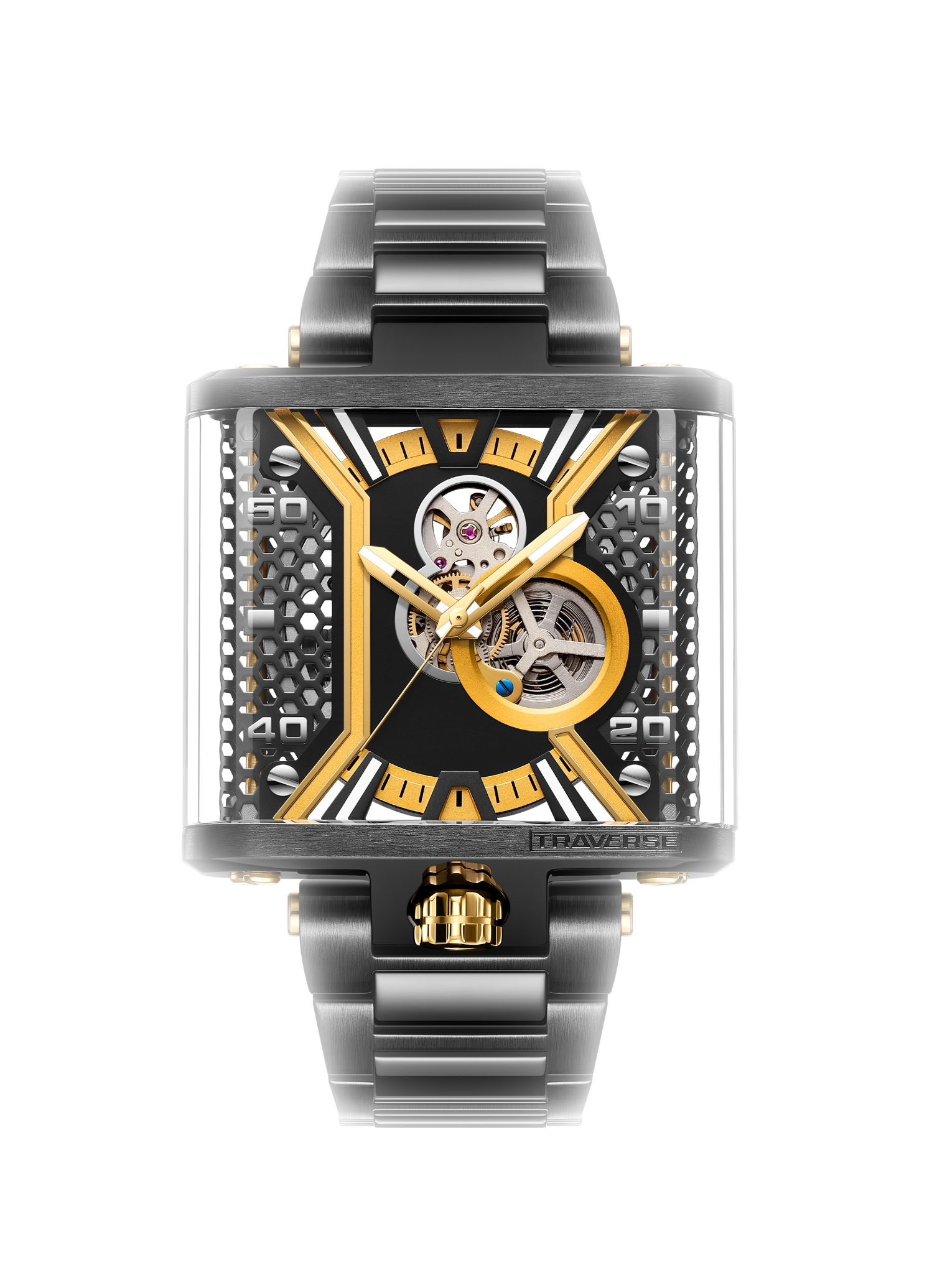 風防には、高い透明度と光沢を持つK9ガラスを採用。まるでクリアなスクリーン越しに、メカニズムの躍動を眺めることができます。また、プレミアムなステンレススティール製のベルトは、重厚感と滑らかな装着感を両立。妥協なき品質が、持つ人の知性を静かに、そして力強く語ります。