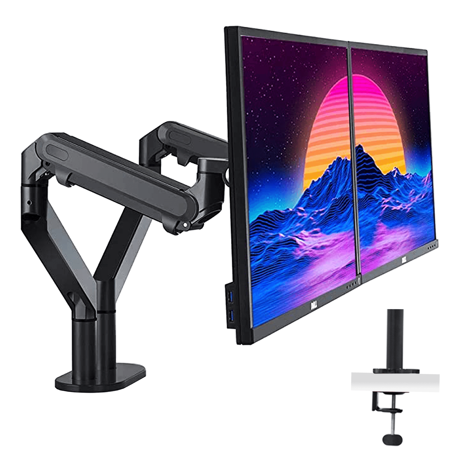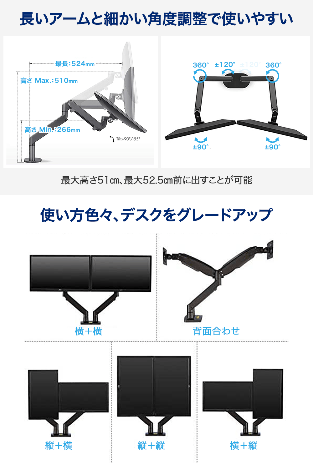 ガススプリング搭載の2画面モニターアームで縦方向に加えて、横方向にも自由自在に移動させることができます。