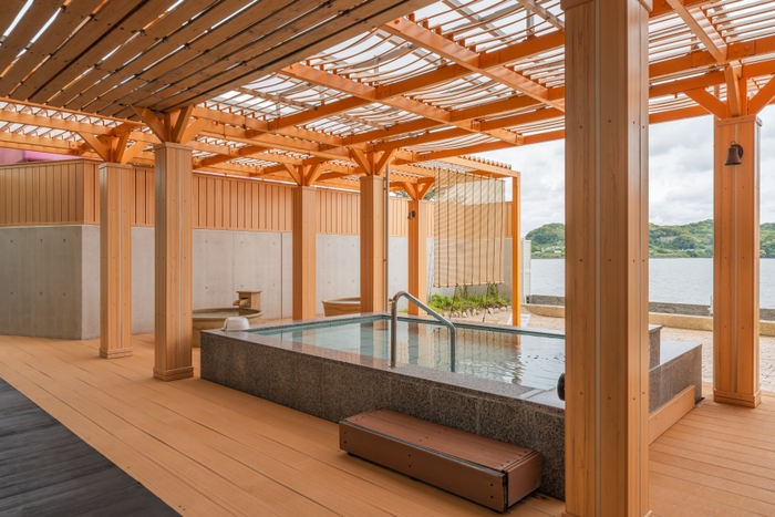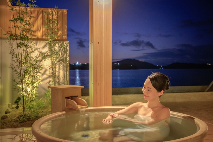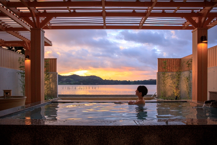 浜名湖が目の前に広がる絶景露天。内湯や、おひとりでゆっくり浸かれる壺湯露天も完備。朝日、夕景で彩りを変える浜名湖ビューをぜひお楽しみください。