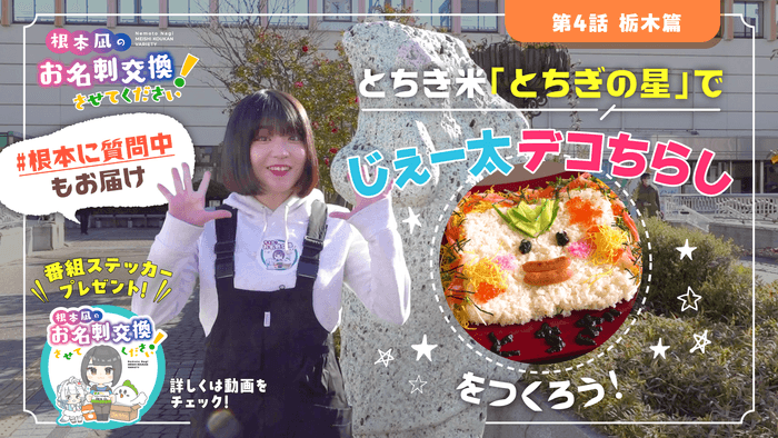第四回の舞台は「栃木県」です。紹介するお米「とちぎの星」は大粒で炊飯後の粒立ちがしっかりしており、冷めてもおいしいといった特徴があります。今回はこの「とちぎの星」を使用した「デコちらし寿司」作りに挑戦します。完成したデコちらし寿司を食べながら「とちぎの星」の魅力やおいしさを伝えます。またデコちらし寿司を作りながら、事前に集めた質問に根本さんが答えるコーナー「#根本に質問中!」もお届けします。