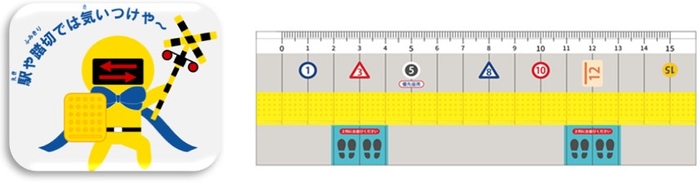 また、学生が考案したオリジナルキャラクター「安全気をつけ隊のマモルンジャー」のイラストがブースのあちこちに登場します。さらに、近鉄との合同企画として、「安全気をつけ隊のマモルンジャー」をデザインしたタオルハンカチ(3年生考案)と、安全啓発を目的とした定規「乗車マナー守ルーラー」(4年生考案)の2種類のグッズ販売も行います。「乗車マナー守ルーラー」は、近鉄電車のホームをイメージし、定規の目盛りに合わせて乗車位置目標をデザインした商品です。グッズは、令和5年(2023年)11月11日(土)・12日(日)、近鉄塩浜検修車庫(三重県四日市市)にて開催される「きんてつ鉄道まつり2023 in塩浜」においても発売予定です。