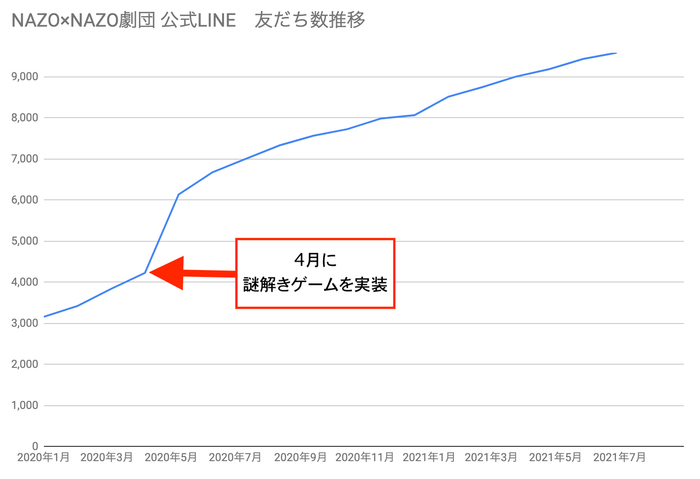 (画像は株式会社ハレガケの公式LINE「NAZO×NAZO劇団」の2020年1月からのLINEフォロワー増加データです。)