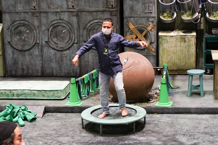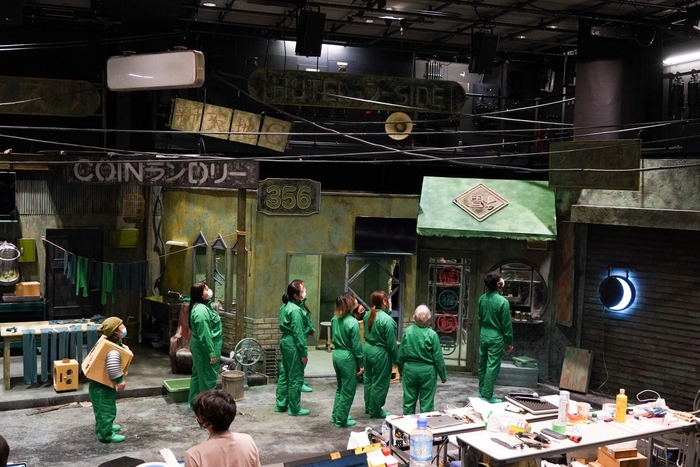 そんな作品を紡ぎ上げる稽古場を訪問した。スタジオには『虹む街』で用意された横浜・野毛をモデルにした飲食店街のセットが組まれている。ただし今回はそこから10年、20年、もしかすると100年先の「街」だ。コインランドリーやスナックはホコリにまみれ、存在がニジんでいるように見える。そのせいで「街」は既に機能を失っているかのように見えるが、もし人々が集まることを「街」の機能とするなら、『虹む街』は辛うじて生きているのだといえるだろう。そこには同じ緑のつなぎを着た人々が、まるで肩を寄せ合うようにして暮らしているのだから。