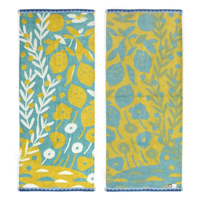 太陽の下でキラキラと輝く穏やかな海。大小の島々には、やさしい潮風に抱かれ豊かに育つレモンやオリーブ。瀬戸内の美しい風景を、手ざわりの良いやわらかな糸で描きました。