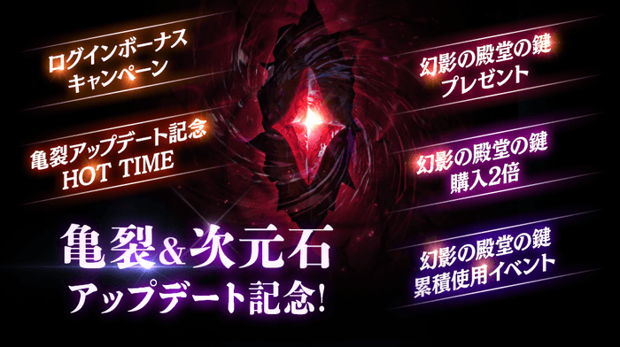 亀裂&次元石の追加を記念して、ログインボーナスイベントや特別HOTTIME、「幻影の殿堂の鍵」毎日プレゼントなどが開催されます。