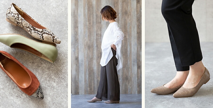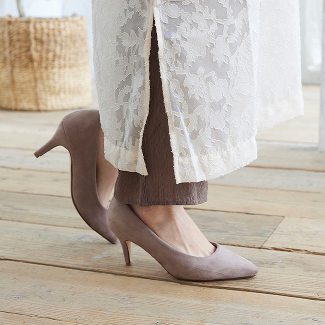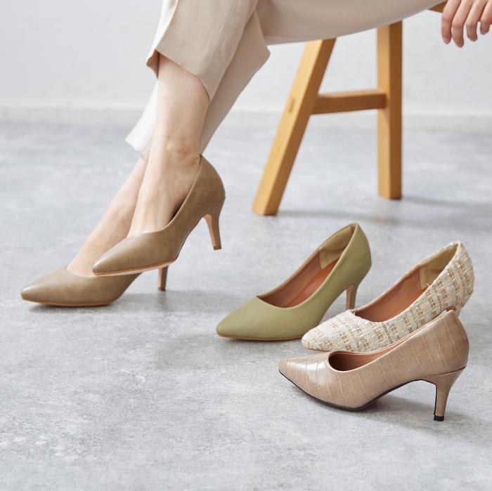 新色発売の7㎝ヒール、3cmヒール以外にも、フラット~7㎝ヒールまで、5種類の展開。お望みの1足に出会えるはず。