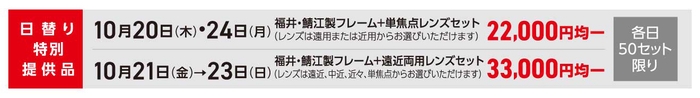 福井・鯖江製フレーム+レンズセットを各日50セット限り、お買得な均一価格にてご用意いたします。また、有名ブランドサングラス各種が特別価格、ジュエリー・ゴールドフレーム+遠近両用レンズセットなどラグジュアリーフレームもお買得なセット価格にてご用意いたします。