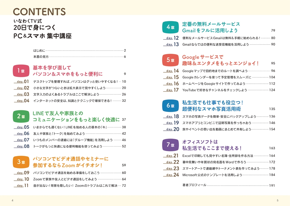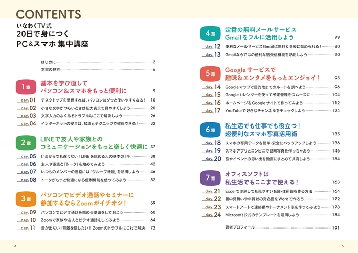 PC教室も営む「いなわくTV」が実地で得た経験から導き出したPCとスマホの本当に”使える”テクニックを多数収録。Windows自体を使いやすくするTipsから、LINE、Zoom、Gmailといったコミュニケーションに役立つアプリの導入&使いこなし方法、さらにはGoogle関連サービスやスマホカメラの活用法や、Excel・Wordの暮らしに役立つ実戦テクニックまで、この1冊でデジタルスキルが格段に向上します。