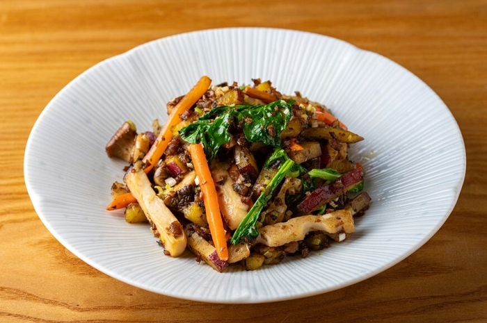 大豆で出来たお肉と季節の新鮮な野菜を使用したきんぴら。お肉不使用とは思えないボリューム感と1食分の野菜を摂取できる。
