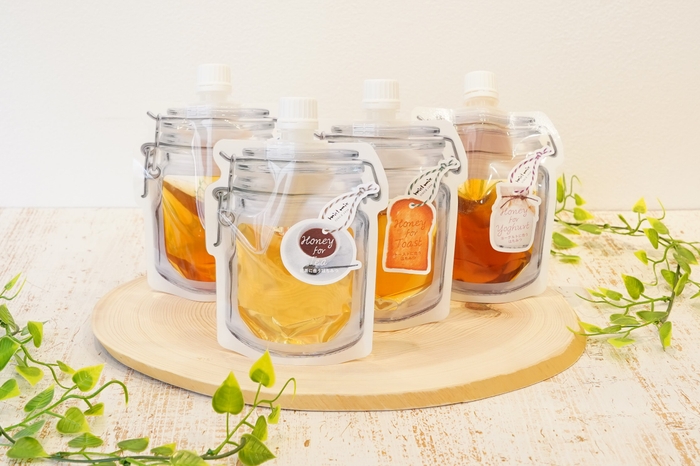 「パンケーキに合う蜂蜜」や「紅茶に合う蜂蜜」など、使いやすい用途別蜂蜜も8種類販売。見た目も可愛いシールアップパウチ入りの蜂蜜はプチギフトにもおススメです。