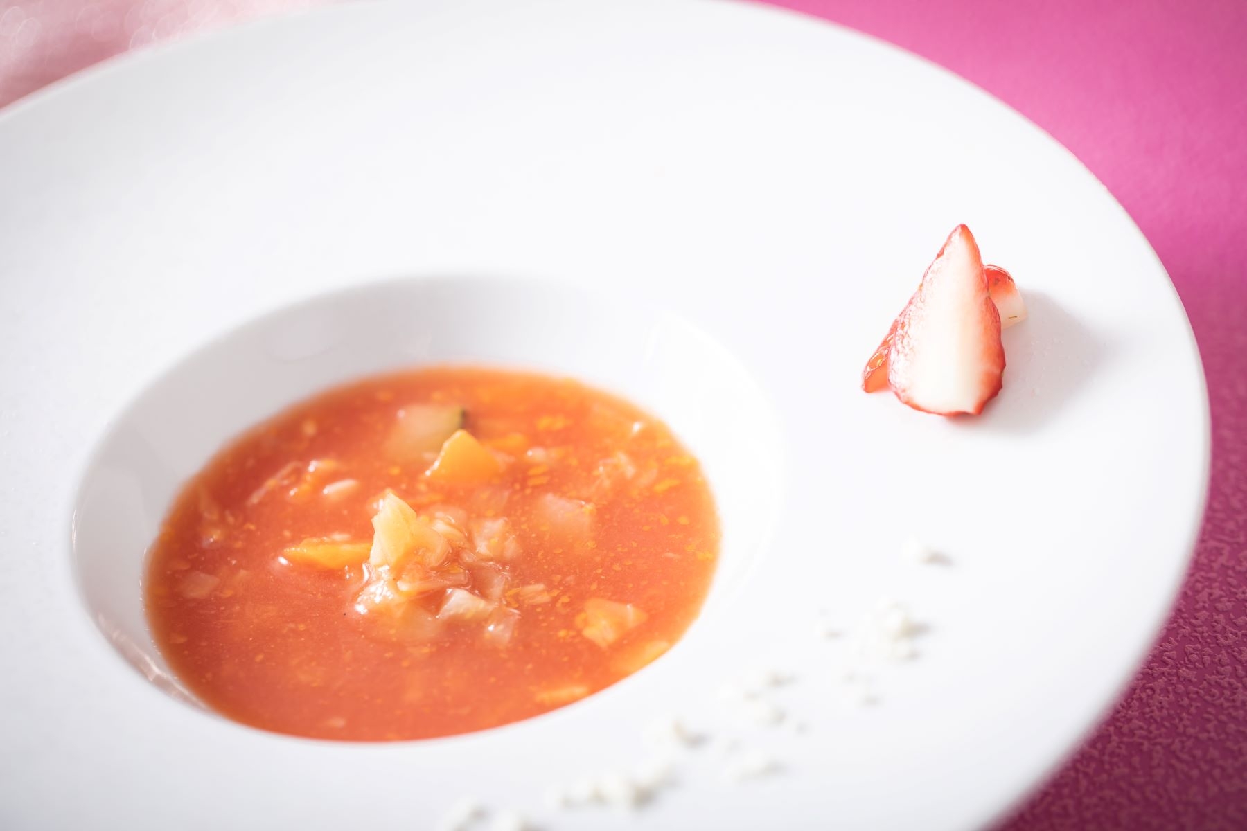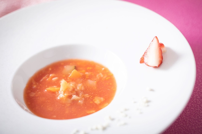 【スープ】トマトのコンソメスープ いちごとパルメザンチーズを添えて