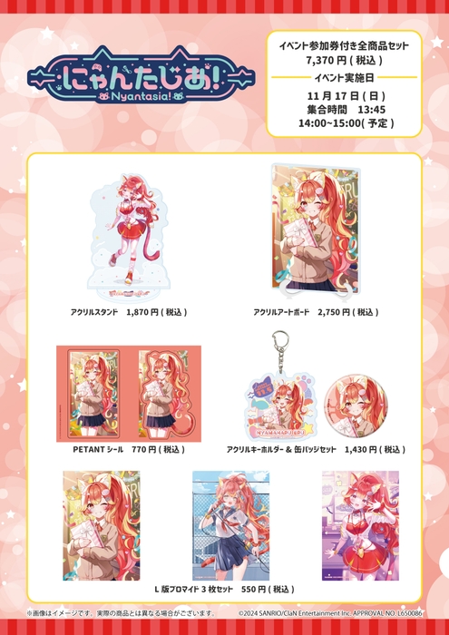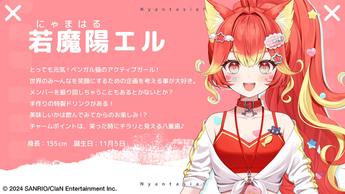 株式会社ClaN Entertainment(本社:東京都港区 代表取締役社⻑:⼤井 基⾏、以下ClaN)は、株式会社サンリオ(本社:東京都品川区)と共同で行うVTuberプロジェクト「にゃんたじあ!」に所属する「若魔陽エル」が11月5日に誕生日を迎えたことを記念し、誕生日グッズの販売を行います。