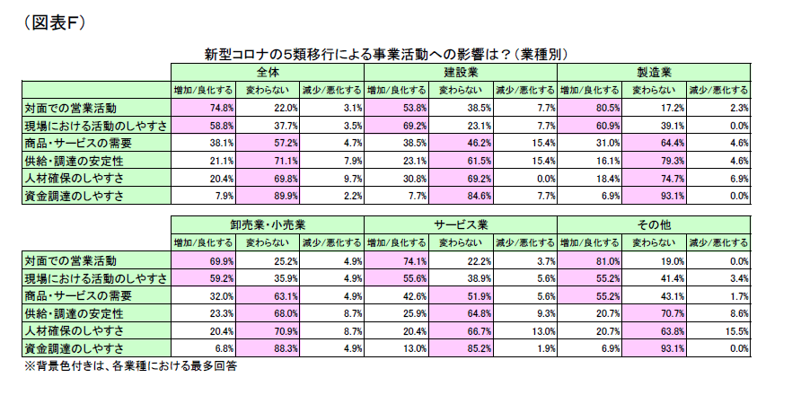 他方、「供給・調達の安定性」、「人材確保のしやすさ」、「資金調達のしやすさ」はすべての業種において「変わらない」の回答が6割超を占めており、5類移行による影響は限定的と考えている様子がうかがえる結果となっています。(図表F)