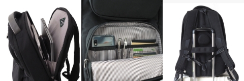 外部にはノートPC用ポケット、前面上下にジップポケット、両脇にオープンポケット、更に背面トロリースリーブの裏に隠しポケットがあります。ポケットの内側にもマルチポケットに使えるポケットを搭載しています。