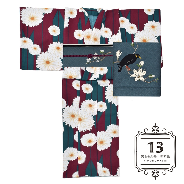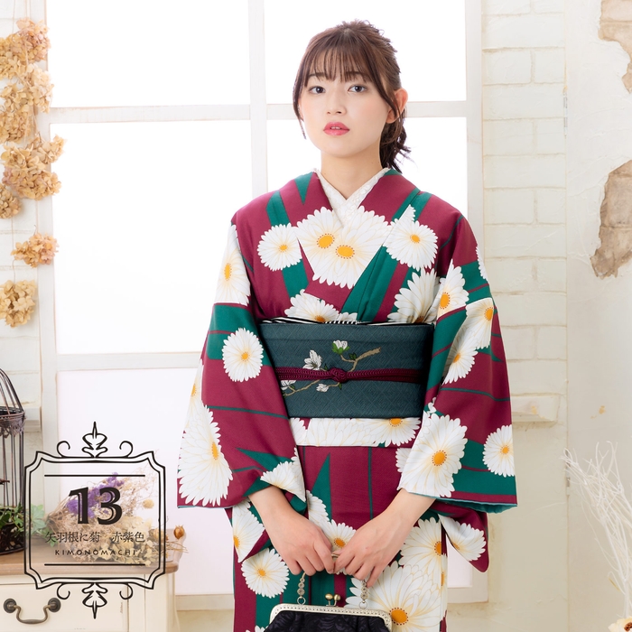 矢羽根に菊 赤紫色