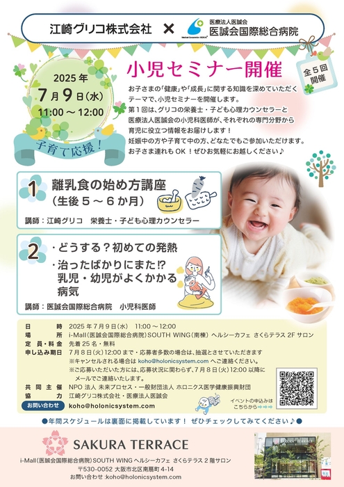 医療法人医誠会(本社:大阪府大阪市、代表者:谷 幸治)は、2025年7月9日(水)、医療複合施設「i-Mall」内のヘルシーカフェさくらテラス2階サロンにて、江崎グリコ株式会社と共同で、妊娠中および子育て中の方向けの無料セミナーを開催します。