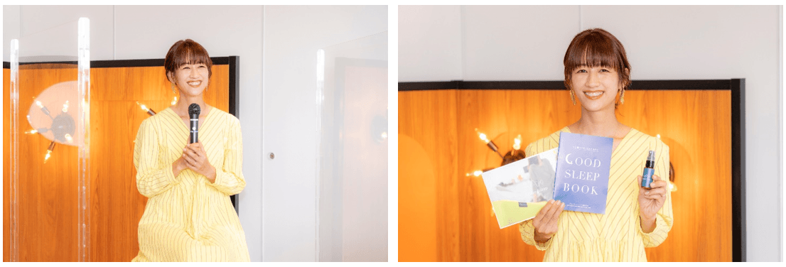 また、前田さんのお話の中にも出てきた“香り”について、椎野は「香りには、ラベンダーやカモミールなどの鎮静作用があるものと、ジャスミンやペパーミントなどの覚醒作用があるものがあります。これらは、入眠や朝の起床に劇的な効果をもたらすものではないですが、補助的に使うことで入眠や朝の起床の一助とすることができます。また、有効性の報告があるものとして、スギやヒノキの木に含まれるセドロールという香気成分は、交感神経活動を抑制する作用があります。就寝前~就寝中の吸入で寝つきや中途覚醒の改善に効果があると確認されています。寝室の木質素材が多いほど不眠症状が少ないというデータも報告されていますが、木のほど良い香りによる効果なのかもしれません」と、香りと睡眠の密接な関係性について解説。加えて、会場に設置されたディフューザーには、ラベンダー、ベルガモット、スイートオレンジなどの精油が使用されており、これらの香りは、ストレスを和らげ、感情のバランスを整えてくれる効果があるのだとか。前田さんは「いつも、お風呂に子どもを入れるときにドタバタしてしまいます。そんなとき、自分に振りかければ子どもたちにも優しい気持ちで声かけができそうです(笑)」と、会場を包み込む柔らかい香りについて感想を述べました。