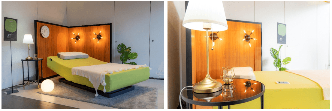 展示は4つのブースにわかれており、すべてのコーナーにおいて、実際に「Active Sleepベッド」を体験することができます。ベッドにはセンサーが搭載されており、呼吸数や心拍数などの体動から入眠・起床を検知。眠りやすさ、寝返りのうちやすさ、起床のしやすさなどを考慮し、その時々によって角度が自動で変化します。また、『読書モード』では読書がしやすい角度を設定できたり、マットレスの柔らかさ・固さの調整も可能。これらはすべてスマートフォンアプリで管理でき、自身の好みによって細かくカスタマイズができるようになっています。