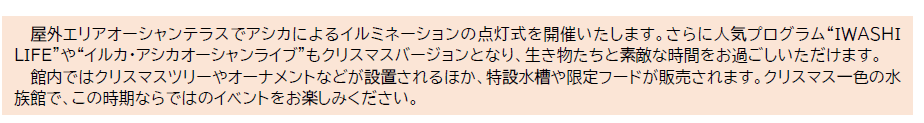 「サメの飼育種類数日本一」のアクアワールド茨城県大洗水族館では、“さぁ、新世海!”をコンセプトに掲げ、様々な取り組みを行っております。このたび、水族館の生き物たちと一緒に楽しめるクリスマスイベントを11月18日(土)から開催いたします。