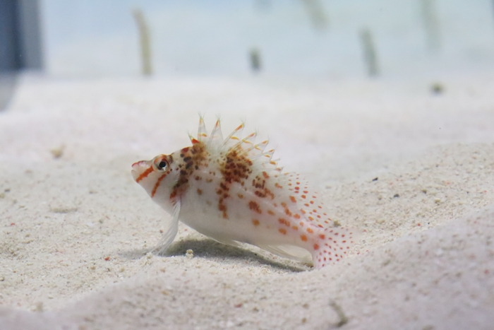 白色の体に赤色の模様があるサラサゴンべ、サンタクロースの衣装のような配色が特徴です。自然界ではサンゴの上にいることが多いため、水槽内に飾られたツリーの上にちょこんと乗る可愛らしい姿を観察することができます。