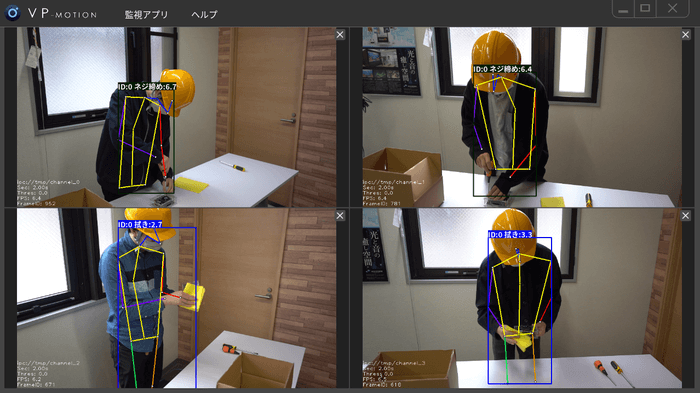 実際に作業解析を行う際には、現場にカメラを設置し、監視システム「VP-Motion Monitor」に前述したオリジナルのAIモデル(学習済モデル)を適用すると、あらかじめ学習させた作業を対象の人物が行った際にリアルタイムで検出できます。同時に解析できるカメラ台数は最大で8台です。(※1)